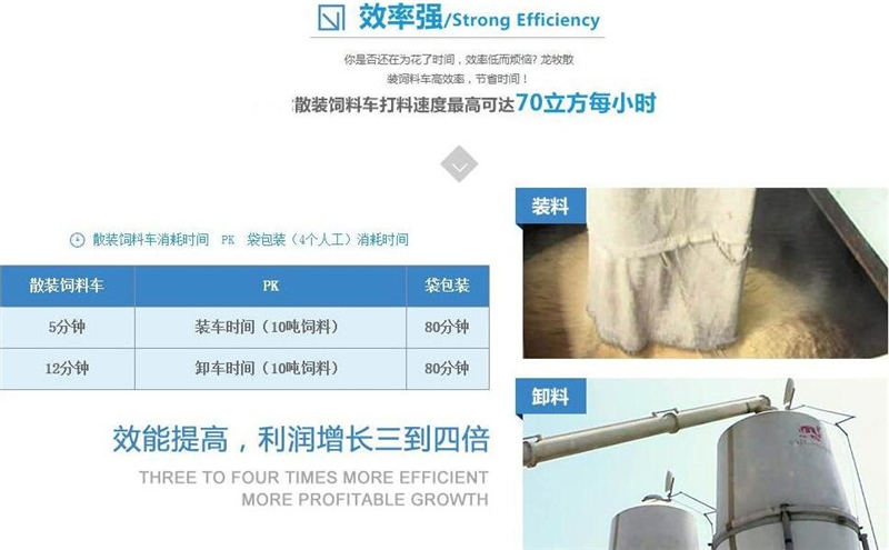 散裝飼料車的優(yōu)勢: 散裝飼料的生產(chǎn)可實現(xiàn)直接生產(chǎn)直接裝車,隨產(chǎn)隨出,不需要進(jìn)行提前備貨,不占用倉儲設(shè)施,也不會出現(xiàn)停產(chǎn)等待拉料的現(xiàn)象,使飼料生產(chǎn)實現(xiàn)計劃管理,生產(chǎn)效率得到提升。 ★獨有倒梯形設(shè)計,散裝飼料在罐體內(nèi)密封輸送,V字形罐體卸料順暢,減少飼料的耗損,保證質(zhì)量,避免污染。 ★運(yùn)輸比包裝成袋運(yùn)輸不但節(jié)省勞動力,而且成本較低。 ★可選電動卸料、全液壓卸料、氣卸為全自動上料卸料,可連續(xù)作業(yè),大大提高生產(chǎn)效率。 ★罐體內(nèi)可加裝分倉,可同時運(yùn)輸多種不同類的飼料或膨人介質(zhì)。部件標(biāo)準(zhǔn)化,容易維修保養(yǎng)。 頂部進(jìn)料倉