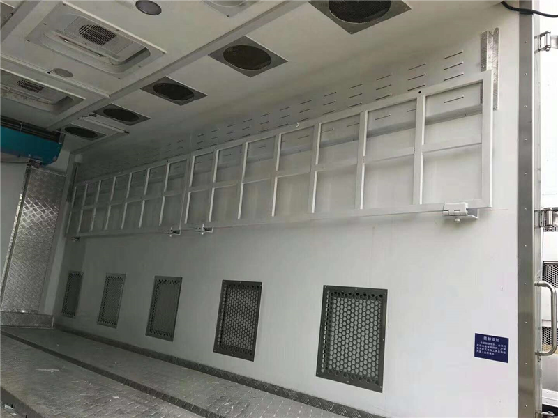 【豬苗車】上裝配置:外玻璃鋼,內(nèi)不銹鋼,兩層液壓升降層板,尾部液壓翻轉(zhuǎn)上豬平臺,層板為不銹鋼骨架鋪鋁花紋板。外部電動(dòng)升降窗,排氣扇,柴油發(fā)電機(jī),暖風(fēng)加熱,喂水系統(tǒng),凈水箱、污水