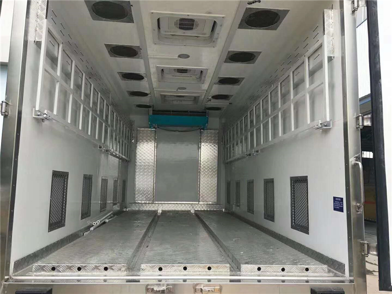 【豬苗車】上裝配置:外玻璃鋼,內(nèi)不銹鋼,兩層液壓升降層板,尾部液壓翻轉(zhuǎn)上豬平臺(tái),層板為不銹鋼骨架鋪鋁花紋板。外部電動(dòng)升降窗,排氣扇,柴油發(fā)電機(jī),暖風(fēng)加熱,喂水系統(tǒng),凈水箱、污水箱,箱內(nèi)攝像頭監(jiān)控,倒車影像,凱利制冷機(jī)組。(油暖加熱為選裝部件)整車長(zhǎng)度12000*2550*3970,箱體長(zhǎng)度9600*2340*2540(8660 裝載長(zhǎng)),發(fā)動(dòng)機(jī):康明斯機(jī)320.