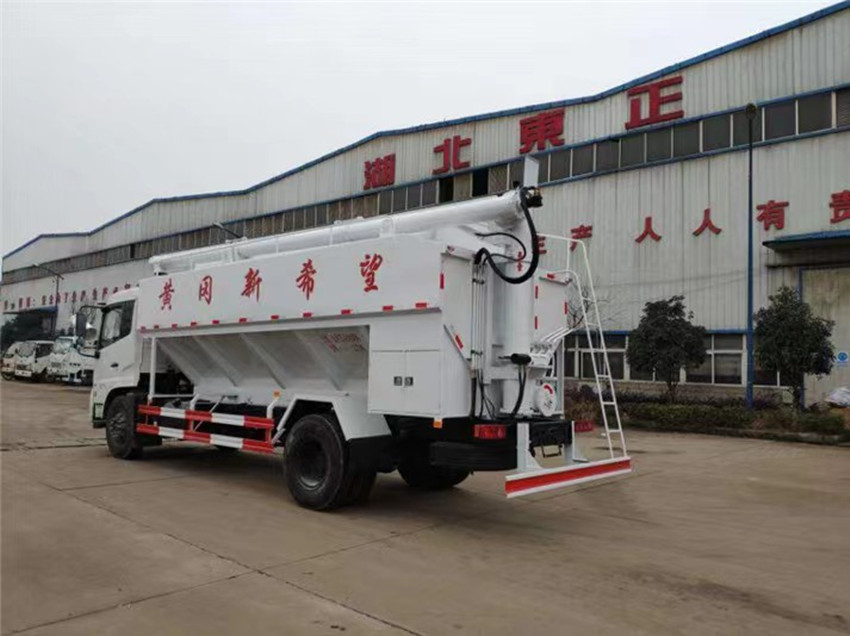 散裝飼料運(yùn)輸車,散裝飼料車的飼料罐架設(shè)在卡車的底盤上,罐頂開有進(jìn)料口.頂部的一根螺旋輸送卸料管(俗稱卸料絞龍)則可自由回轉(zhuǎn)和抬升,抬升的仰角可達(dá)60度。運(yùn)輸時(shí),頂部的螺旋管平臥在罐頂;卸料時(shí)則抬起,使管端的出料口與畜禽飼養(yǎng)場貯料罐頂部的進(jìn)料門相接,駕駛室內(nèi)裝有操縱裝置(操縱裝置也可裝置在罐體尾部),卸料時(shí)通過車底的動(dòng)力輸出軸和減速器來驅(qū)動(dòng)螺旋,以完成卸料。