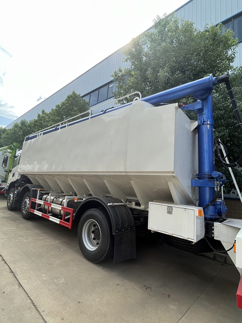 散裝飼料運輸車,散裝飼料車的飼料罐架設在卡車的底盤上,罐頂開有進料口.頂部的一根螺旋輸送卸料管(俗稱卸料絞龍)則可自由回轉和抬升,抬升的仰角可達60度。運輸時,頂部的螺旋管平臥在罐頂;卸料時則抬起,使管端的出料口與畜禽飼養(yǎng)場貯料罐頂部的進料門相接,駕駛室內裝有操縱裝置(操縱裝置也可裝置在罐體尾部),卸料時通過車底的動力輸出軸和減速器來驅動螺旋,以完成卸料。