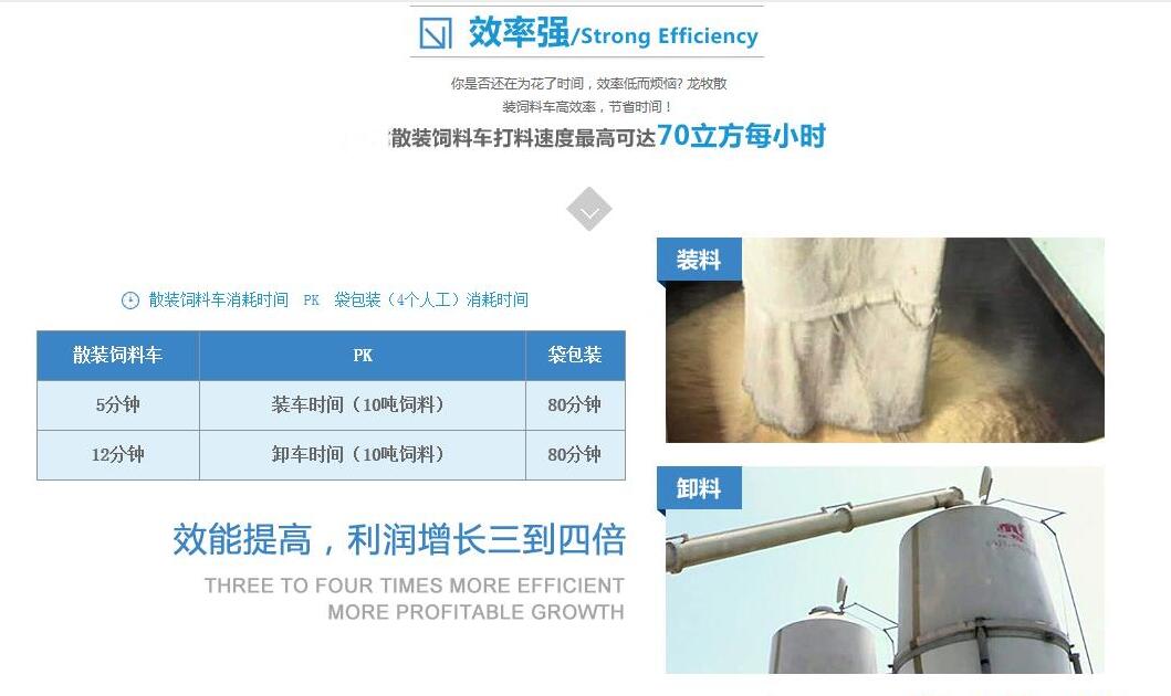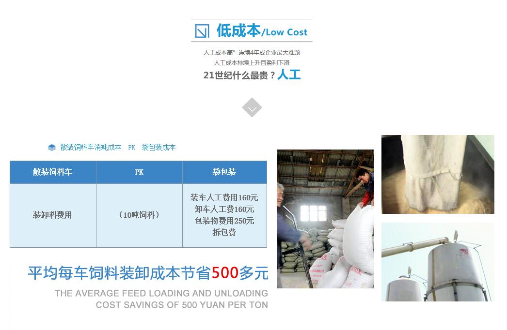 1 經(jīng)濟(jì)效益、勞動時(shí)間等對比 項(xiàng)目 袋包裝 飼料罐 裝卸費(fèi)用(1噸飼料) 18元(人工) 2元(電耗) 包裝袋費(fèi)用(1噸飼料) 20元 0元 裝車時(shí)間(10噸飼料) 60分鐘 20分鐘 卸車時(shí)間(10噸飼料) 60分鐘 30分鐘 從上表中可以直觀的看出:1.在裝卸費(fèi)用上,散裝運(yùn)輸比袋包裝運(yùn)輸要節(jié)約16元/噸。2.在包裝費(fèi)用上,散裝運(yùn)輸比袋包裝運(yùn)輸要節(jié)約20元/噸。3.在裝卸時(shí)間上,散裝運(yùn)輸比袋包裝運(yùn)輸要節(jié)約70分鐘。通過以上統(tǒng)計(jì)分析發(fā)現(xiàn),散裝飼料運(yùn)輸車經(jīng)濟(jì)效益非常明顯。